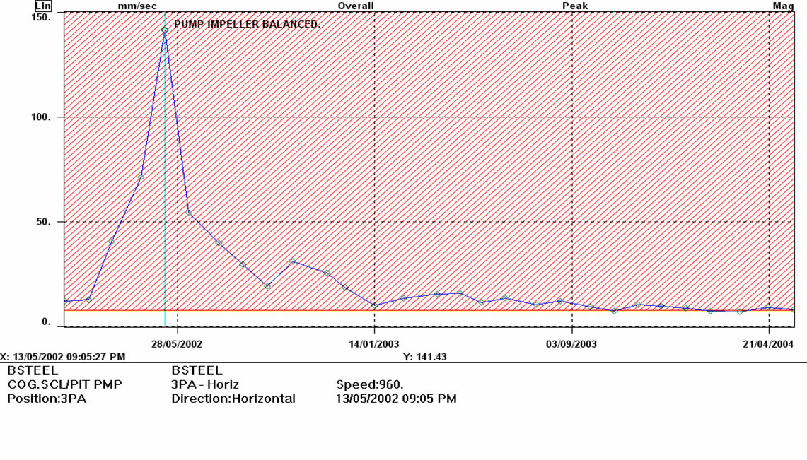 An example of a pump impeller showing high and increasing vibration levels, unit balanced and normal levels resumed without failure occurring.